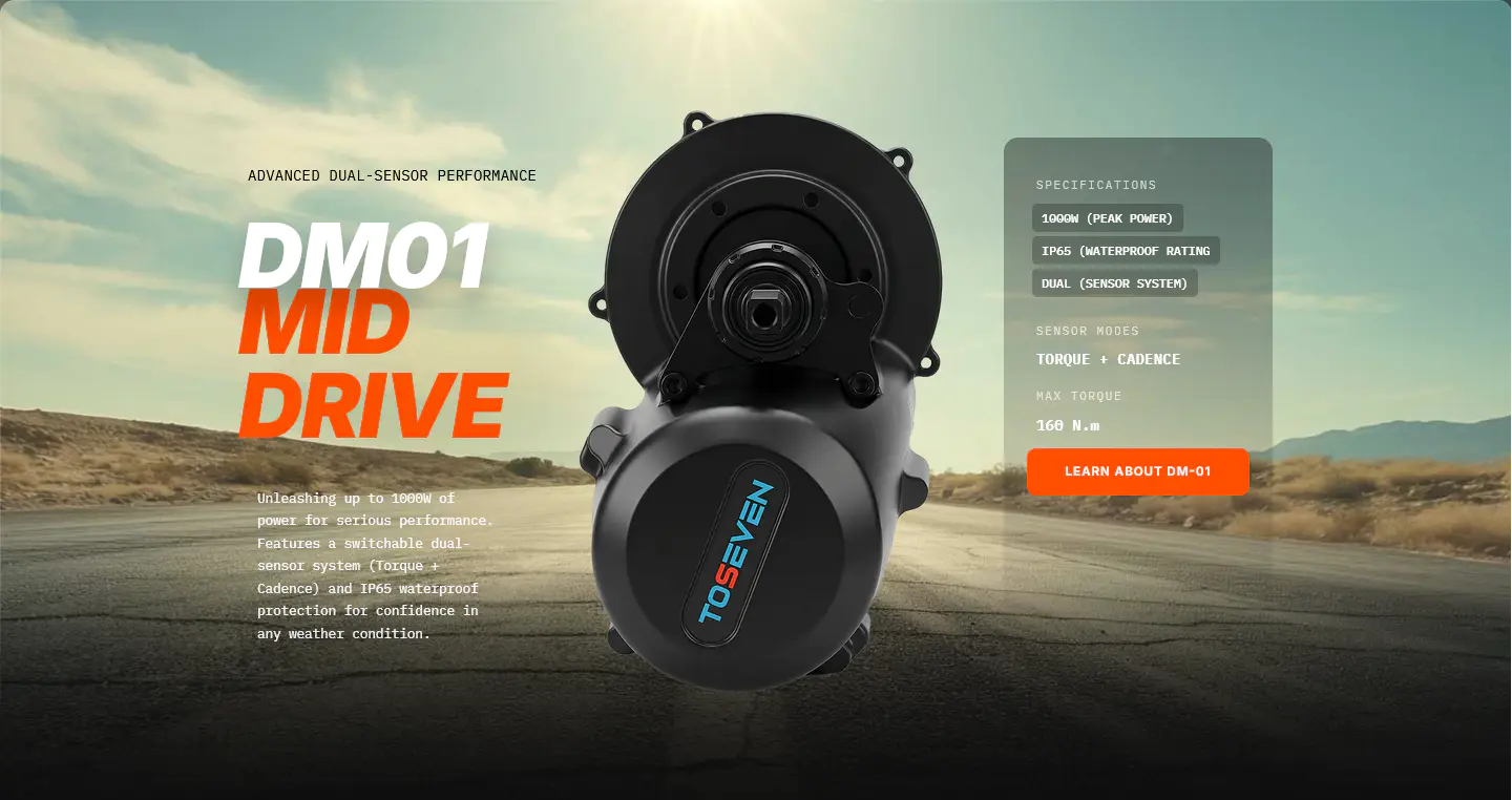 The ToSeven DM-Series mid-drive e-bike motor redefines the riding experience with its unparalleled performance, whisper-quiet operation, and seamless integration. Designed for a wide range of ebike styles, the DM-Series motor seamlessly blends into your bike, providing a powerful riding experience.
