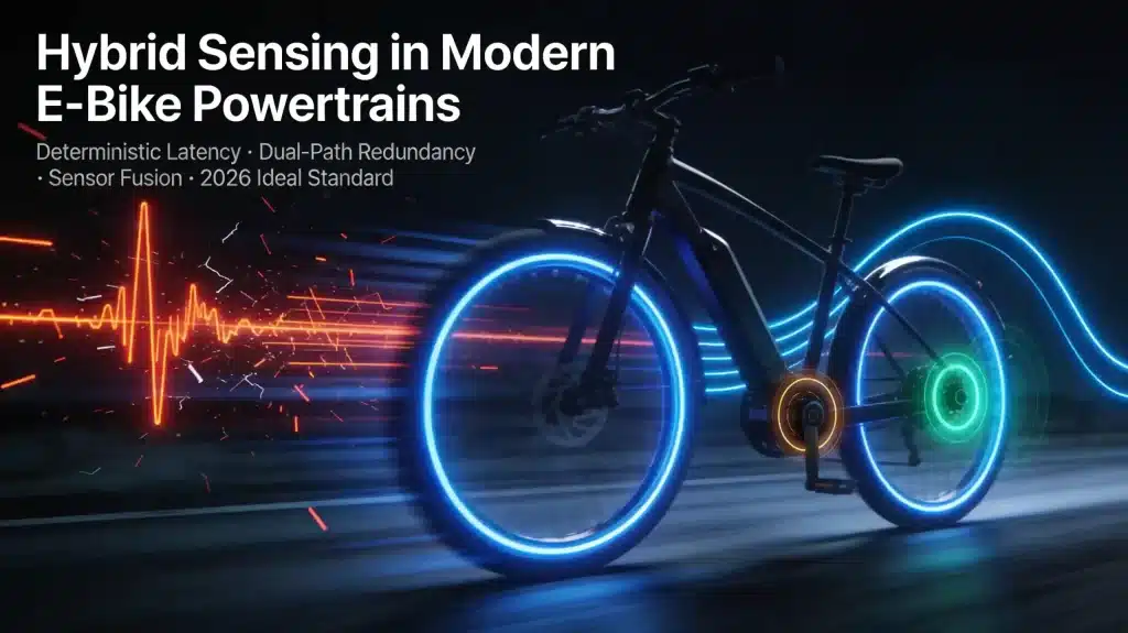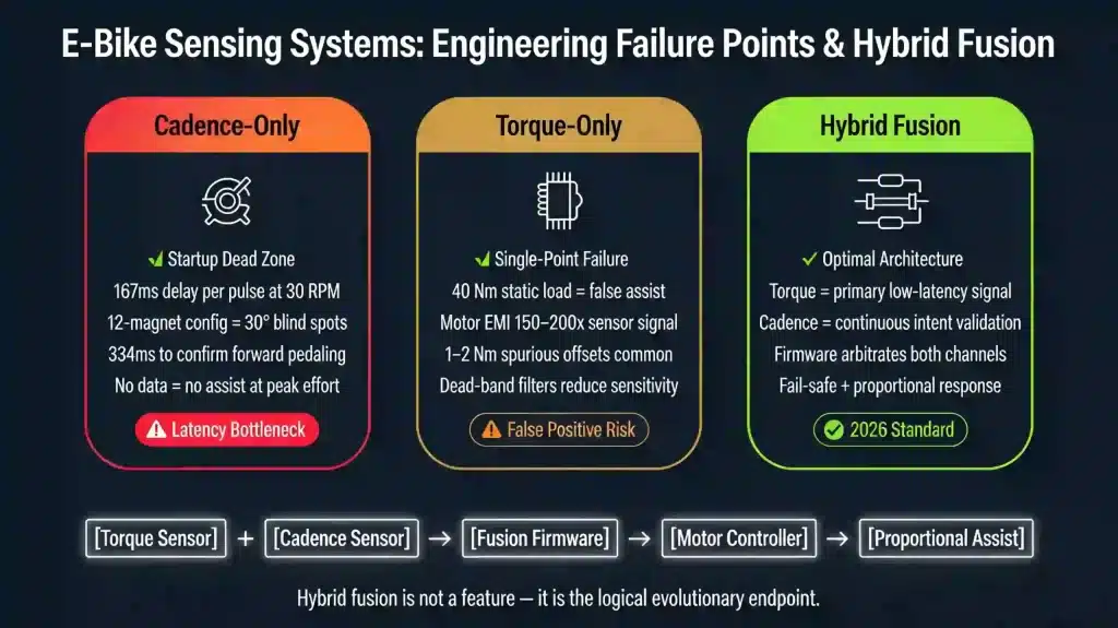 Once the failure modes of cadence-only and torque-only systems are viewed together, the outline of a hybrid solution emerges almost inevitably. Cadence sensing provides unambiguous confirmation of rotational intent but is bounded by startup delays; torque sensing provides sub-millisecond force measurement but cannot on its own discriminate between intended motion and static loading. The only coherent architecture for safety-critical and high-performance 2026 applications is therefore one in which: