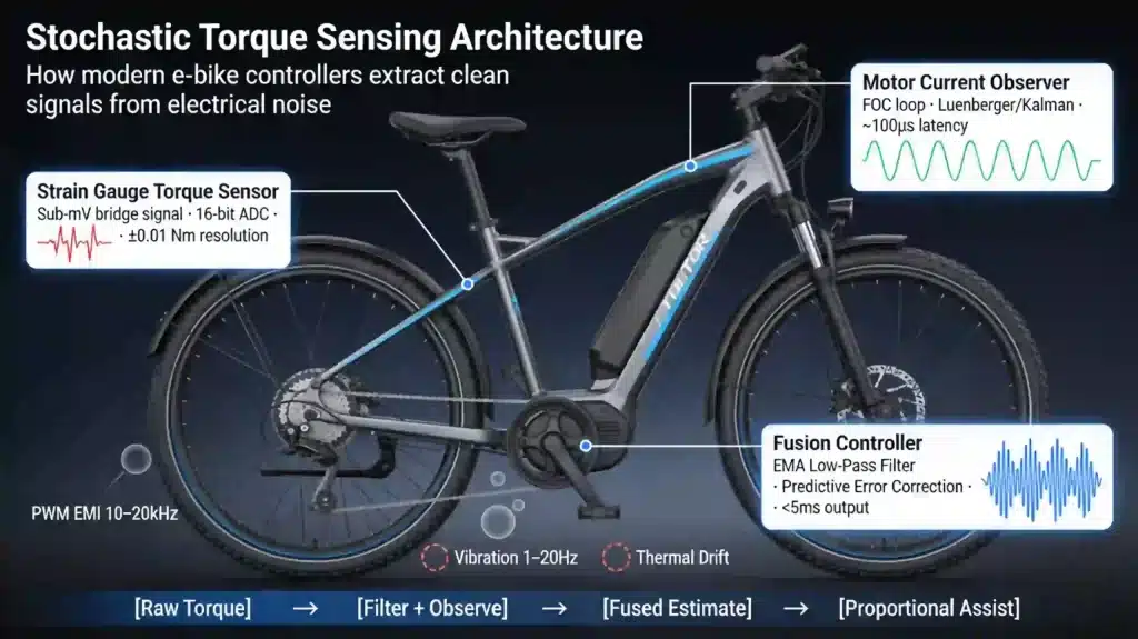Electromagnetic interference compounds the problem. Strain gauge bridges operate at millivolt levels, while motor phase currents of 30-50 A switching at 10-20 kHz produce magnetic fields 150-200 times larger in magnitude at typical sensor distances. Even with careful shielding and differential amplification, it is common to observe spurious offsets of 1-2 Nm, and a torque-only control law has no independent reference by which to distinguish a 2 Nm sensor artifact from a 2 Nm rider input. In practice, designers respond with threshold logic, dead-band filtering, and rate limiting to prevent small spurious inputs from producing abrupt assistance. Yet every such safeguard adds latency or erodes sensitivity to low forces, meaning the system pays for safety with diminished responsiveness or reduced ability to reflect nuanced rider intent.