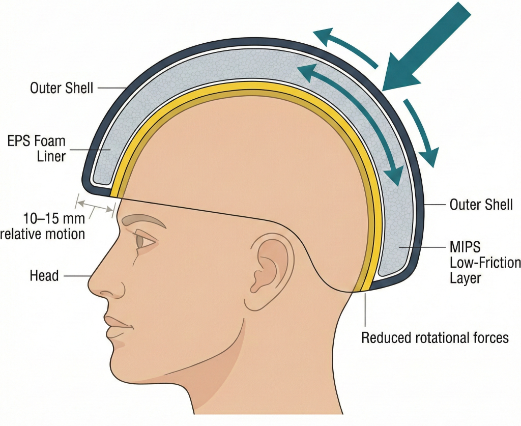 MIPSA low-friction layer to reduce rotational forces that cause concussionsAngled falls; rotational brain injury risk