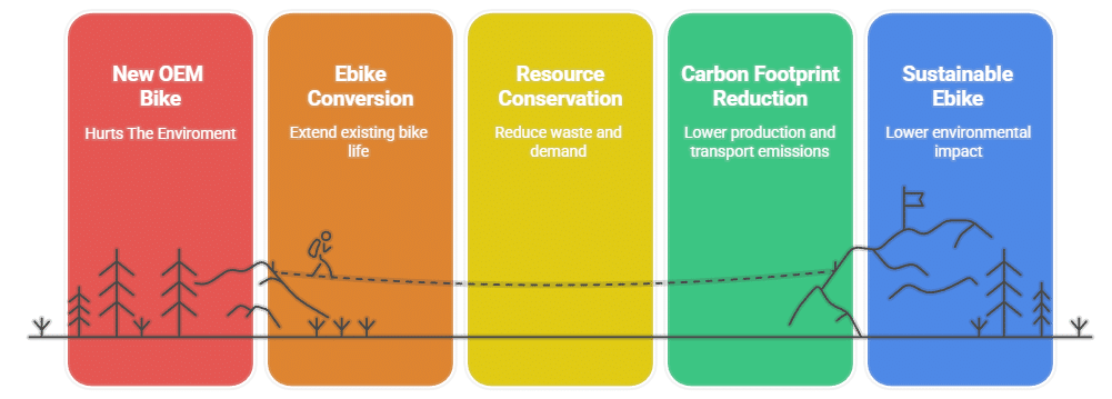 Buying a new OEM-equipped bike introduces additional packaging, accessories, and often duplicate parts (lights, racks, fenders). A conversion kit typically generates less packaging and fewer redundant parts, and reuses existing bike components.
