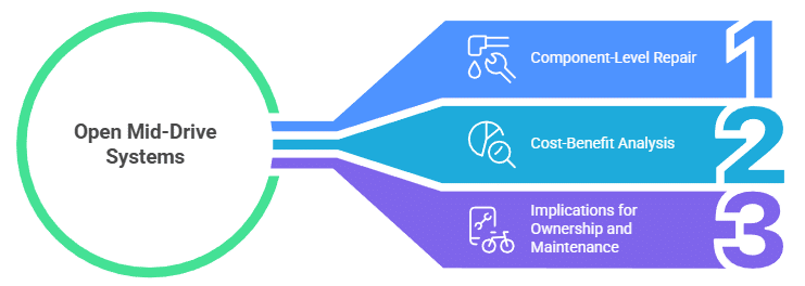 Component-level repair is a significant advantage of open mid-drive systems. Pros include lower maintenance costs and increased longevity of the ebike. Cons may involve the need for specialized knowledge and tools for DIY conversion.